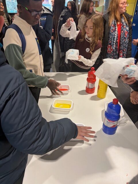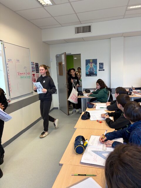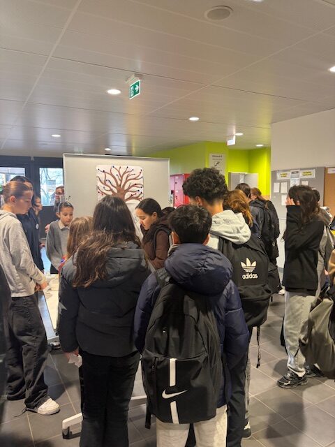 – distribution des badges en musique mardi matin, avec les élèves qui montrent des affiches explicatives
